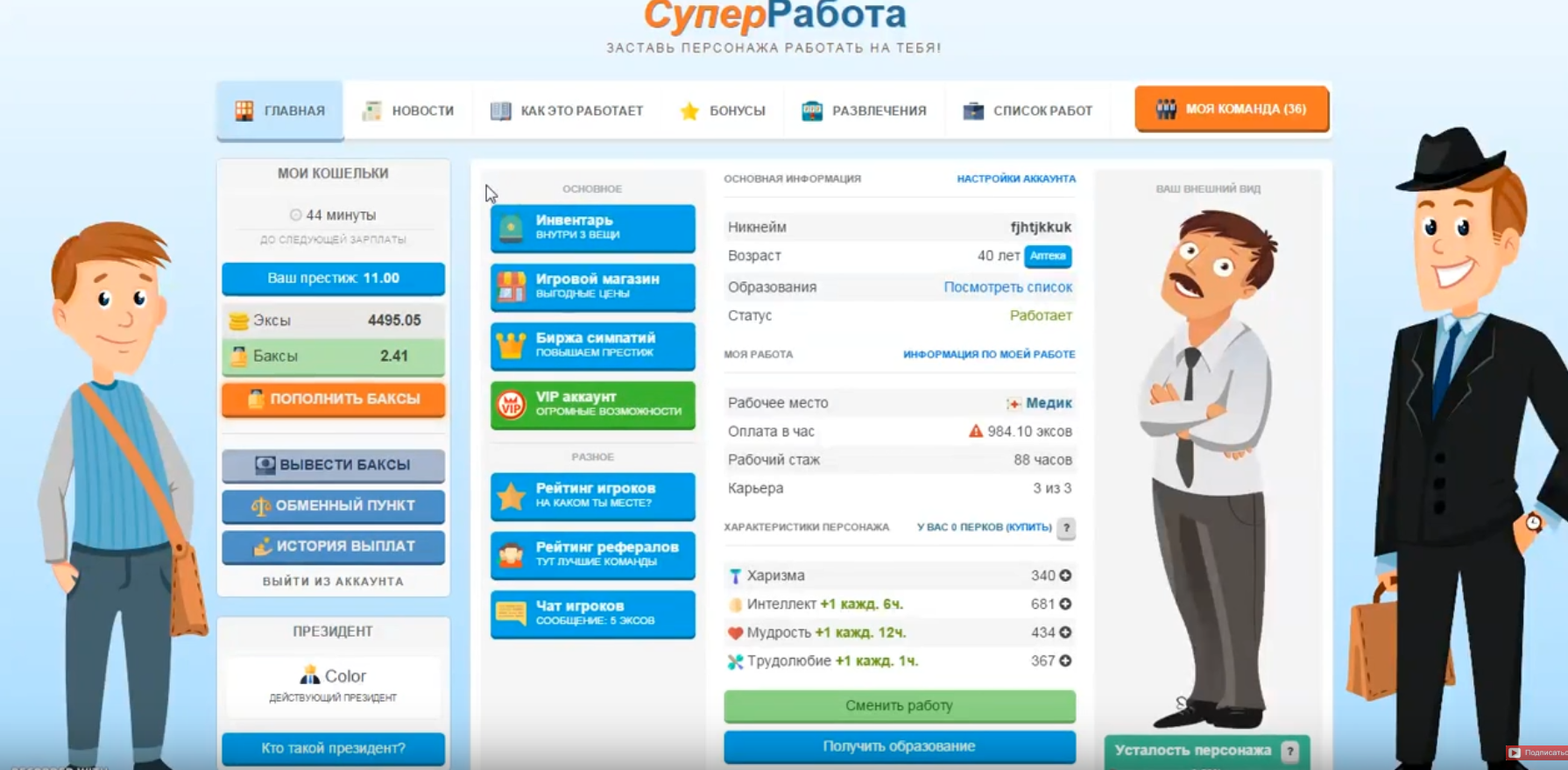 Работа была проделана колоссальная. Придумана оригинальная концепция заработка: надо создать персонаж, который взрослеет, стареет, учится, меняет работу. На каждом виде работы зарабатываются определённые баллы: престиж, трудолюбие, интеллект, мудрость. Но и отрицательные баллы имеются: усталость. Чтобы работать да и жить дальше, персонаж надо кормить и лечить. Есть ещё волшебный препарат «молодин», уменьшающий возраст, но стоящий игровые баксы, которые зарабатывает персонаж.